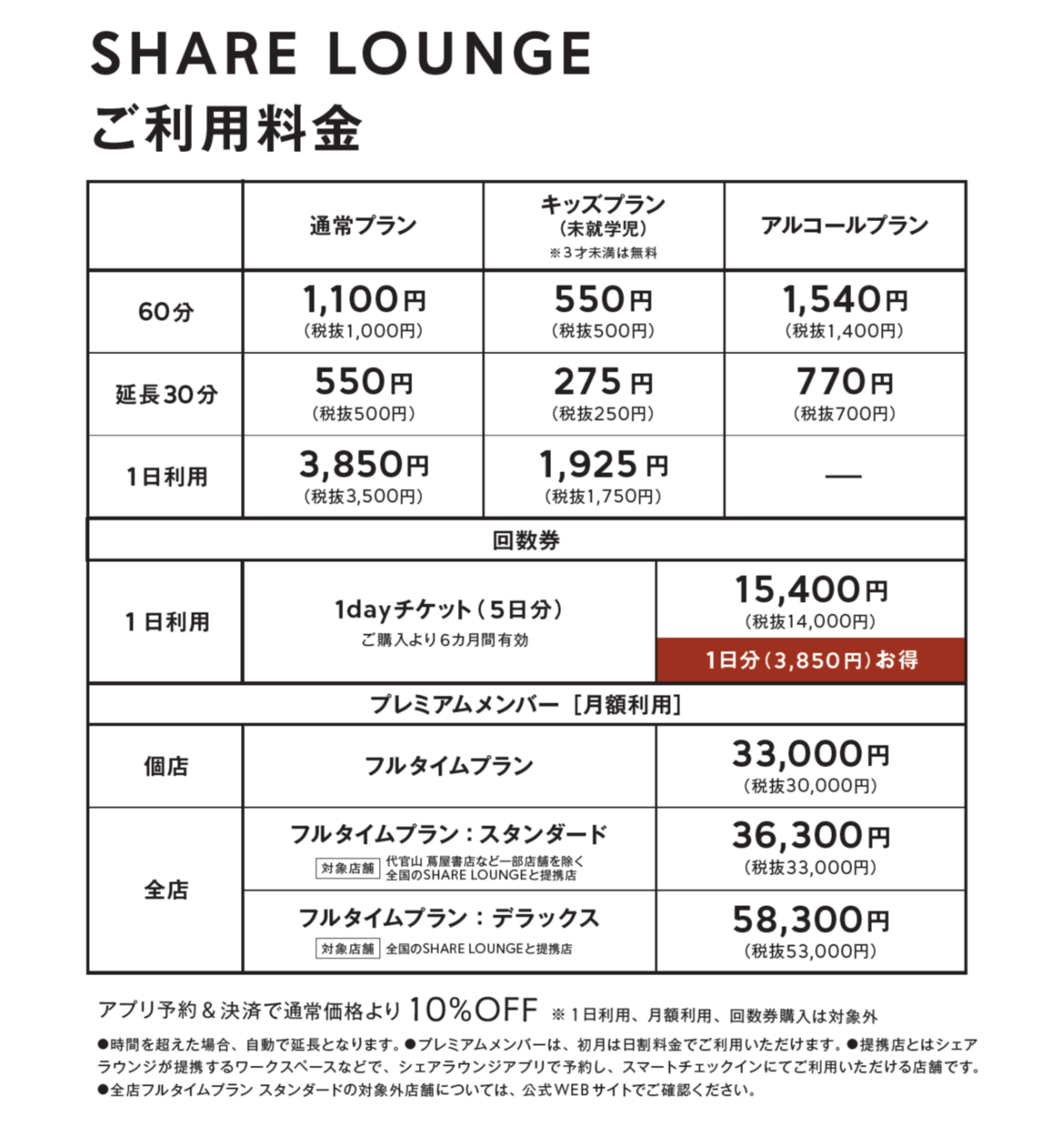 ■「SHARE LOUNGE 海老名」料金表
