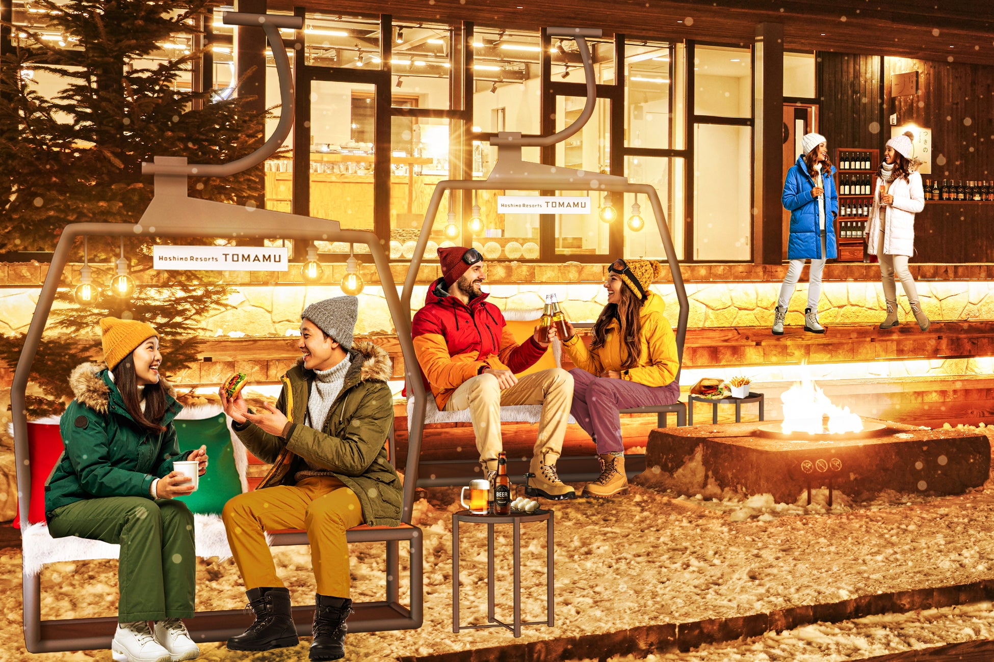 北海道の大地を感じるネイチャーワンダーリゾート「星野リゾート トマム」では、2025年12月26日〜2026年4月4日の期間、滑り終わってもまだ終わらない!スキー場の余韻に浸る冬の新イベント「つきのdeアプレスキー」を開催します。ゲレンデの中腹に位置する「ホタルストリート」は、食事や買い物が楽しめる9店舗が並ぶスキーインスキーアウトヴィレッジです。会場はその一角にある、Café&Hamburger「つきの」です。ライトアップと音楽が彩る空間では、お酒やオリジナルメニューとともに、アフタースキーが楽しめます。本物のリフトをリメイクしたペアリフトチェアも登場し、滑走後もスキー場の余韻に浸れます。