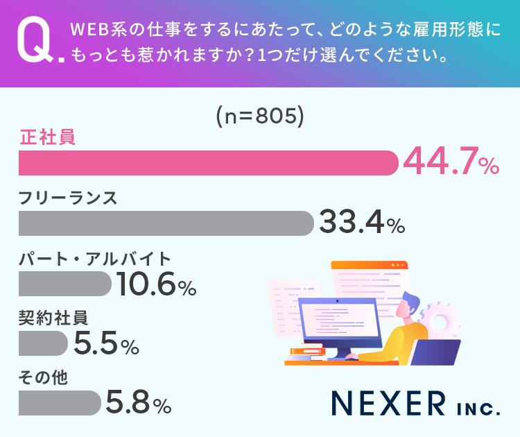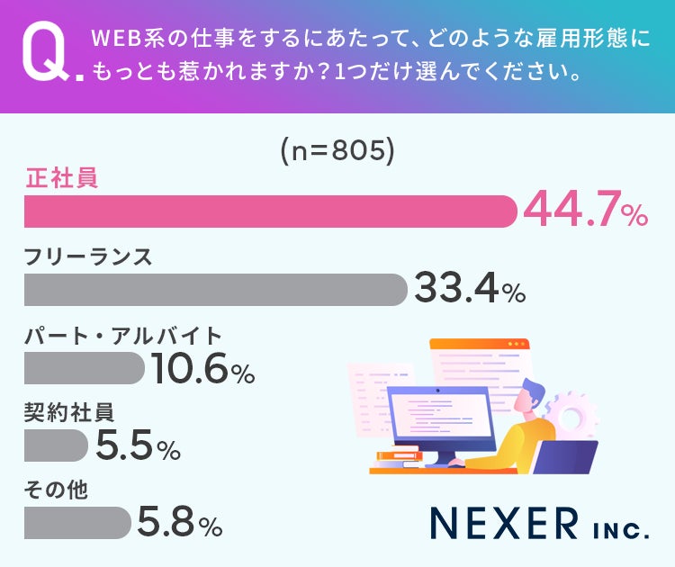 続いてWEB系の仕事をするにあたって、どのような雇用形態にもっとも惹かれるか聞いてみました。