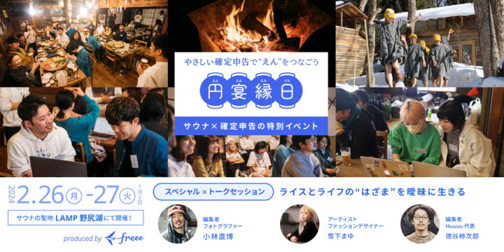 freee株式会社(本社:東京都品川区、CEO:佐々木大輔、以下「freee」)は、昨年度に引き続き、サウナの聖地・LAMP野尻湖 TheSaunaにて確定申告を行うイベント「円宴縁日(えんえんえんにち) in NAGANO 〜やさしい確定申告で“えん”をつなごう〜」を開催することをお知らせします。また、併せて、イベントへの参加者18名を募集します。