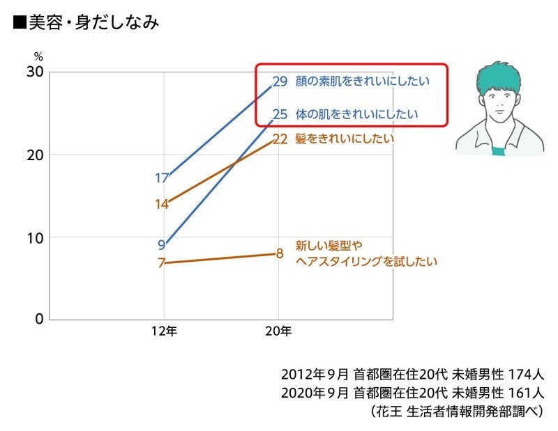 美容や身だしなみについて聞いた調査で、2012年と2020年を比較すると、「顔の素肌をきれいにしたい」(+12%)、「体の肌をきれいにしたい」(+16%)がいずれも10%以上高くなっています。