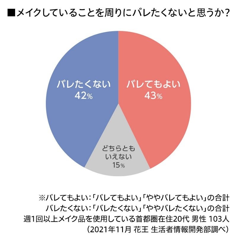 メンズメイクへの関心は高まっていますが、まだ『メイクは女性がするもの』と言った固定概念が強く、メイク男子においても、「少し恥ずかしい」とメイクをしていることをバレたくない人と、「自信を持てる、隠すことではない」とバレてもよいと考える人が半々の割合で見られます。また、今回の調査では、「時間をかけてメイクをしているのに、気付かれないと悲しい。」といった声も聞かれました。