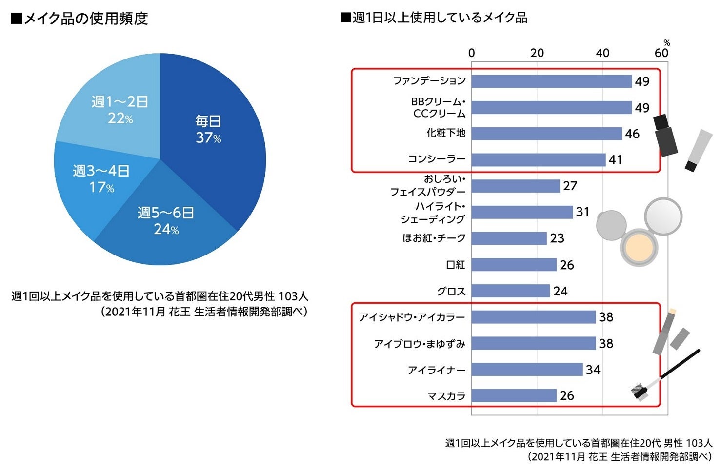 花王株式会社「生活者情報開発部」(※1)では、20代男性のスキンケア行動について定期的に調査をおこなっています。最新の調査では、スキンケア行動の定着とともに、ベースメイクを含む美容意識に広がりがあることがわかりました。首都圏在住20代男性の調査をすると、およそ9%の男性にメイク経験があり、そのうち週1回以上メイク品を使用する人は4%でした。大手百貨店ではメンズメイクのコーナーが展開され、SNSでも男性によるメイクに関する投稿が増えるなどの動きが見られます。メンズメイクを日常的に取り入れている首都圏の「20代美容男子(メイク男子)」(2021年11月実施)について報告します。