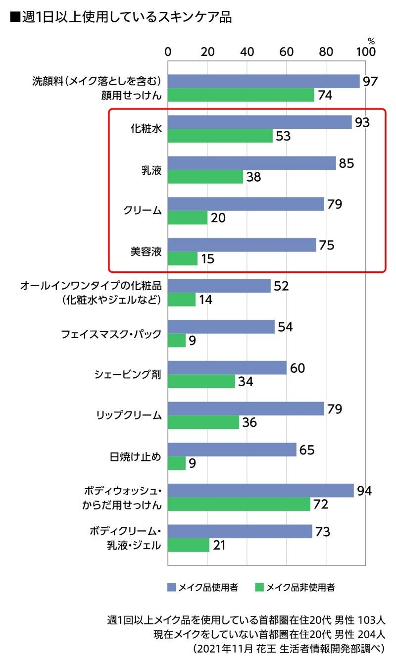 「きれいな肌になりたい」と考えるメイク男子は、メイクをしない20代男性に比べ、スキンケア品全てにおいて使用率が高く、中でも、化粧水、乳液、クリーム、美容液の使用率は75%以上と高く、スキンケアを含めた美肌に対する意識の高さがうかがえます。
