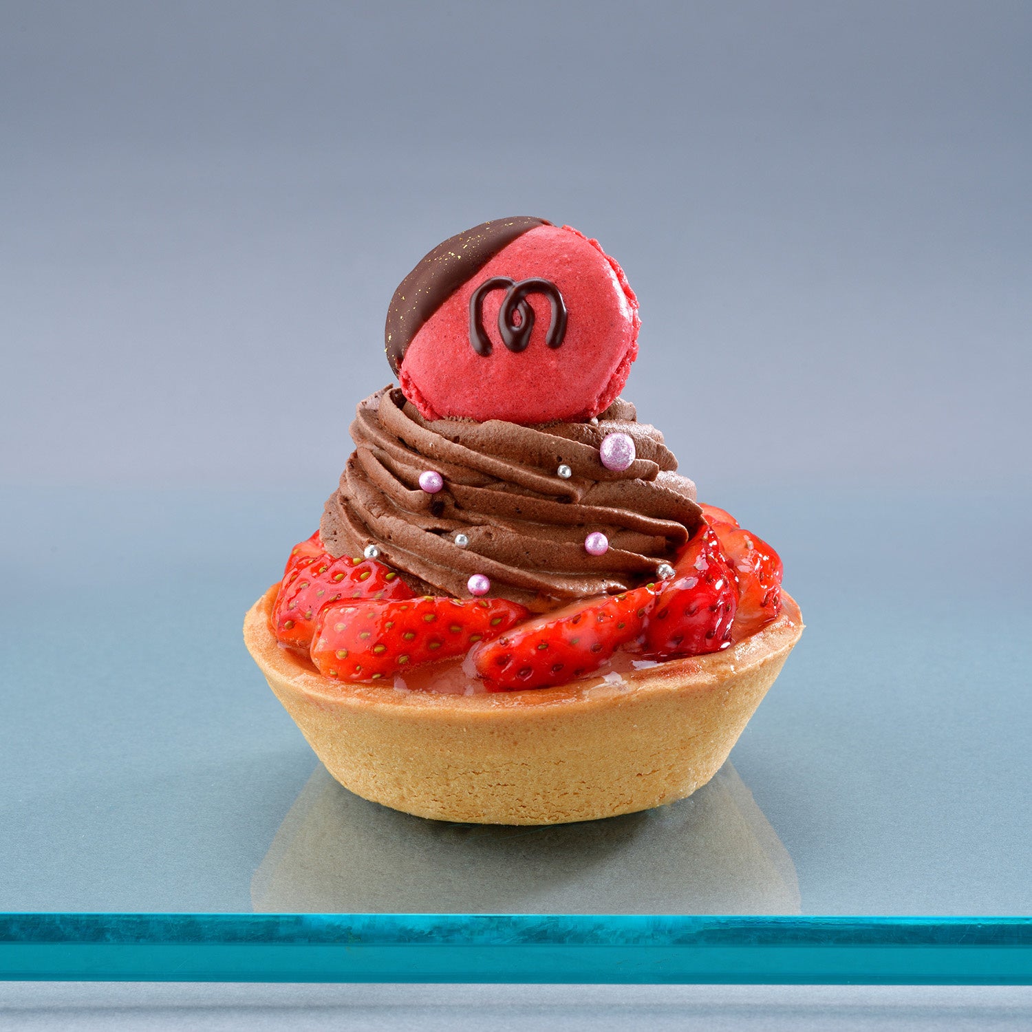 いちごたっぷりのチョコタルトに、マキシムトマトをモチーフにしたマカロンをトッピング。