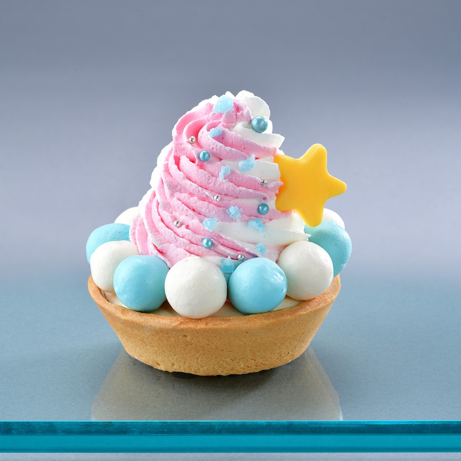 パステルカラーのメレンゲをころんとあしらったタルト。ふんわりやさしいバナナあじ。