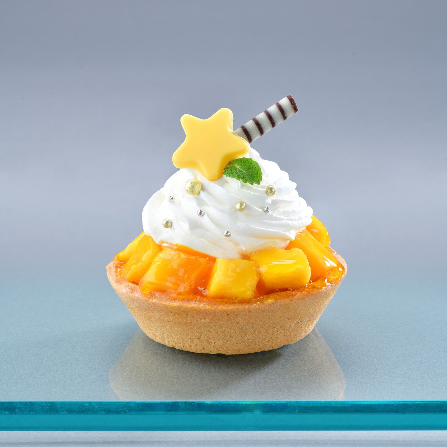マンゴーたっぷりのタルト。てっぺんにきらめくのは、チョコレートでできたスターロッド。