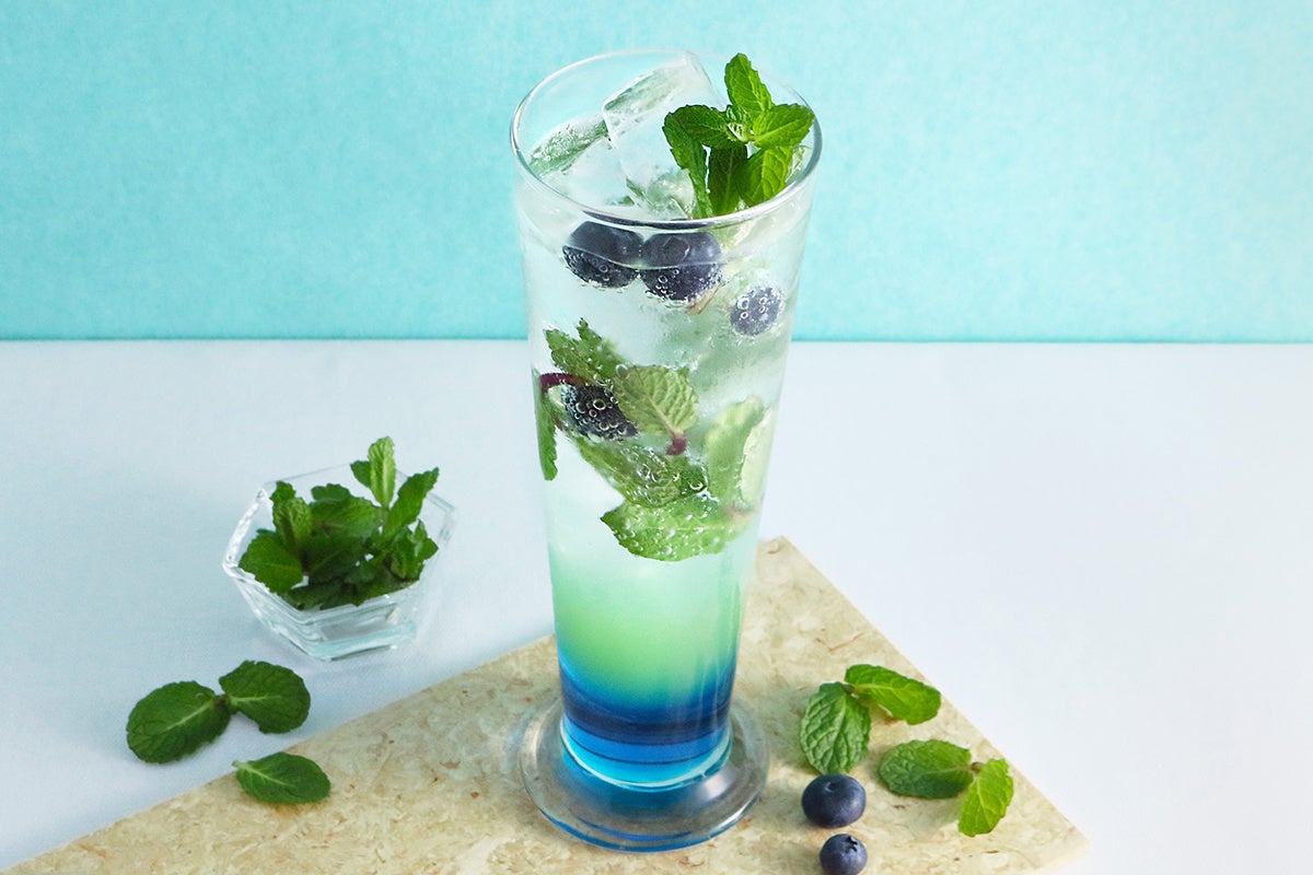 メキシコ定番ドリンクのモヒートをマーファ風にアレンジ。ブルーのミントシロップの爽やかさに甘~いパイナップルジュースが今の季節にピッタリなドリンクです。