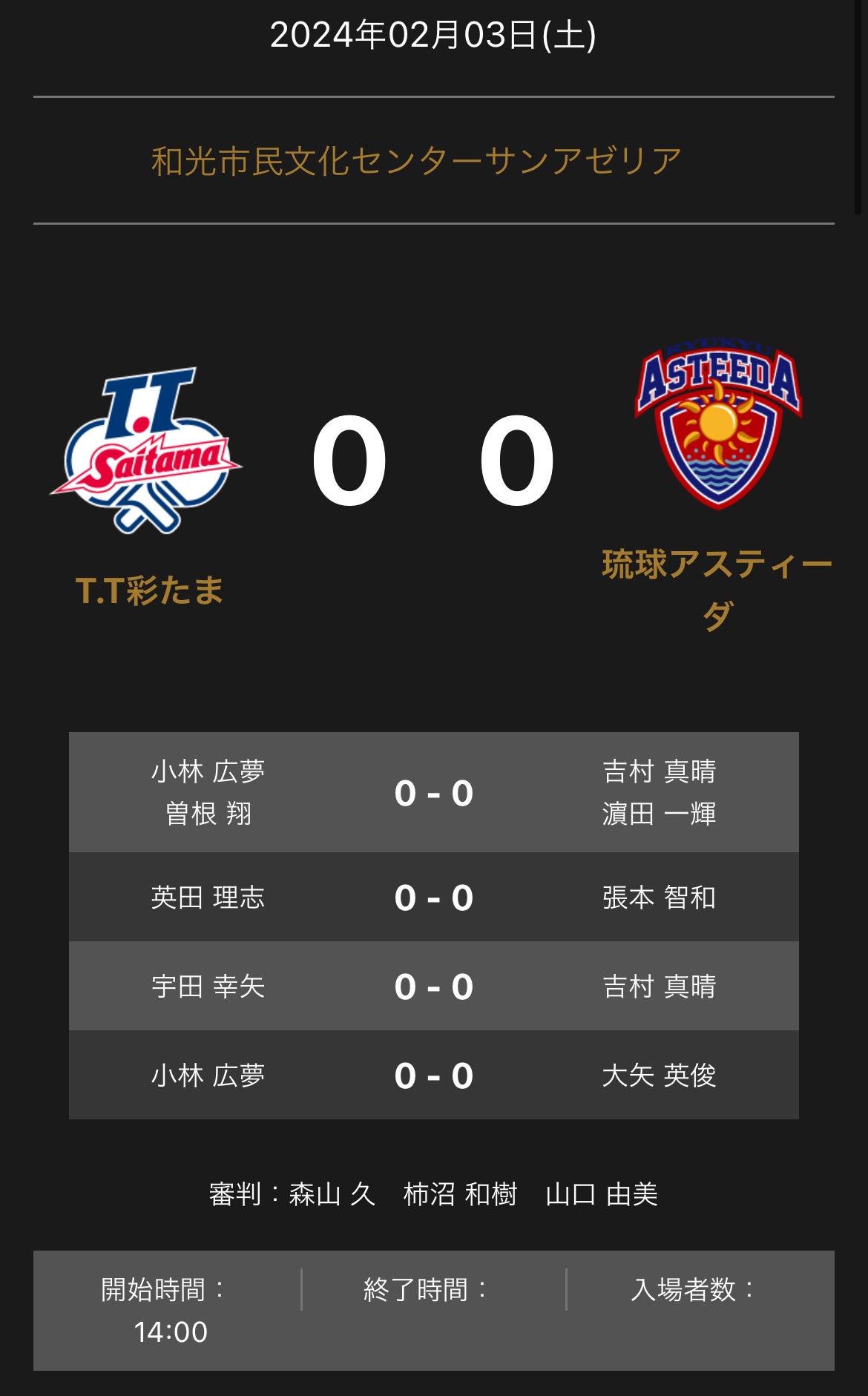 ノジマTリーグ 2023-2024シーズン 公式戦2月3日開催 T.T彩たま vs 琉球アスティーダ オーダー発表