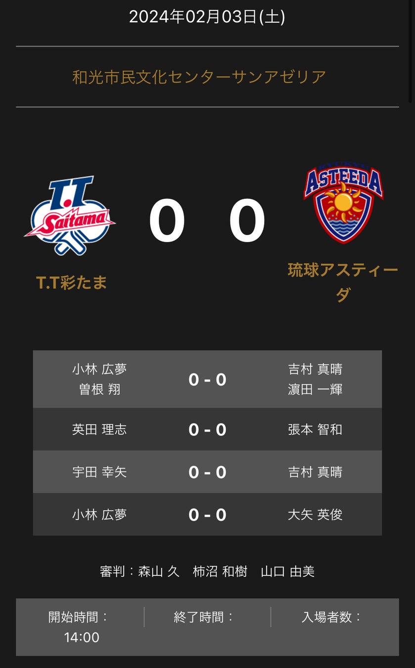 ノジマTリーグ 2023-2024シーズン 公式戦2月3日開催 T.T彩たま vs 琉球アスティーダ オーダーを発表いたします。