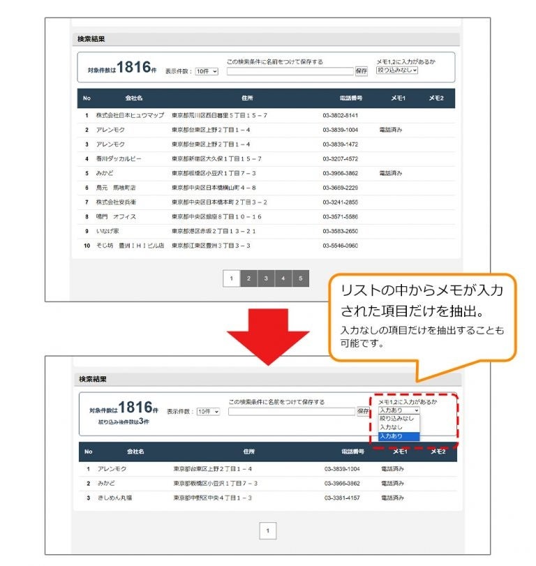 ご好評のメモ記述欄を簡単に抽出できる機能です。メモを記述したレコードを長いリストの中からでも抽出して見つけ出せます。