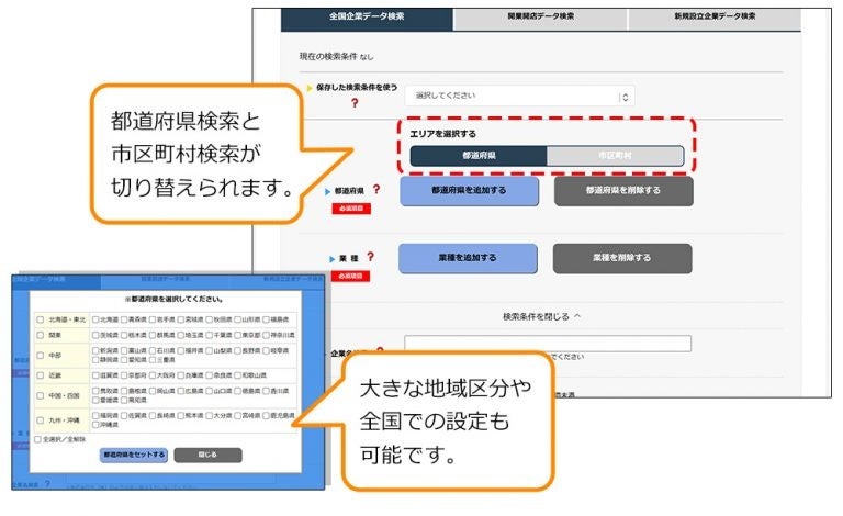 「最新全国企業データベース」の都道府県単位のエリア検索機能、