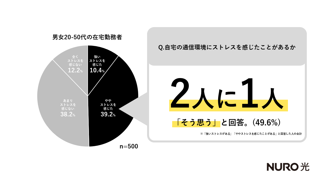 在宅勤務者に対しての「普段、自宅の通信環境にストレスを感じたことがありますか。」との質問に対して、「強いストレスがある」「ややストレスを感じたことがある」と回答した人は49.6%に。およそ2人に1人は自宅の通信環境にストレスを感じているという結果が明らかになりました。