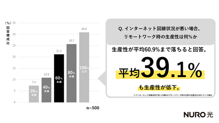 さらに、「インターネット回線状況が良い場合のリモートワーク時の仕事の生産性を100%とした場合、 インターネット回線状況が悪い場合のリモートワーク時の生産性は何%か」に対して平均「60.9%」と大幅な下落。通信環境が業務効率に与える大きな影響が明らかになりました。