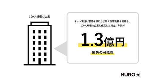 ③社員100人規模の企業で社員が在宅勤務をする場合、ネット回線にストレスを感じている環境のまま業務にあたると、その企業の損失規模は、約1.3億円(年間)にも上る可能性。