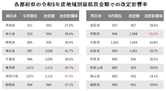 西日本の集計地域では、改定影響率が最も高い地域は京都府の51.1%、次いで大阪府の43.8%、和歌山県の39.2%となった。京都府は今回の改定で時給1,000円では出せなくなるが、この影響が大きく出ているようだ。