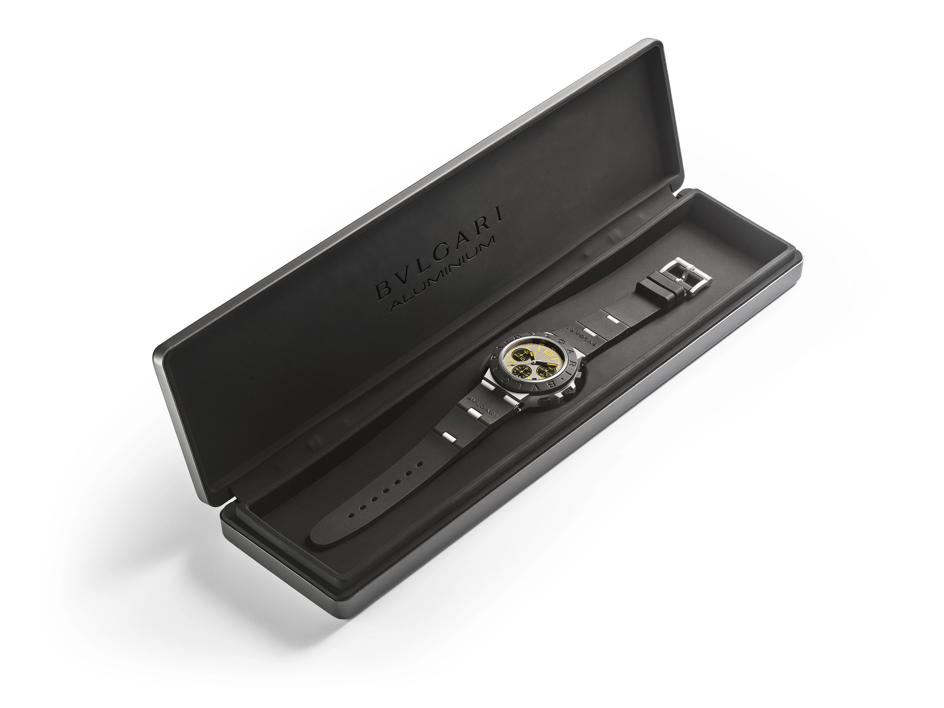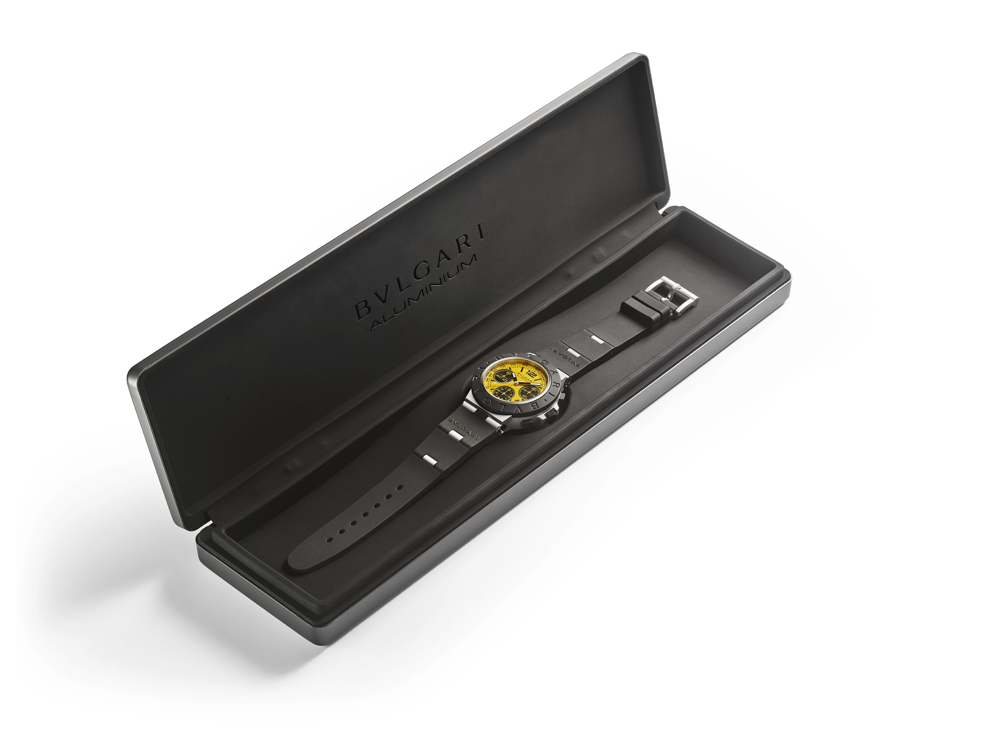 このタイムピースは、「ブルガリ アルミニウム」の魅力的で大胆なキャラクターを通して「グランツーリスモ」の世界観を表現しています。本来のスマートさとクールさはそのままに、1990年代の伝説的なイタリアのグランツーリスモカーのダッシュボードのダイヤルにインスピレーションを得た、鮮やかなイエローが目を捉えます。堅牢な軽さを誇るアルミニウムケースと、”BVLGARI”の文字が刻印されたベゼルに使用されたソフトなラバーがセットされています。スポーティで革新的な素材の融合は、アルミニウムリンクを特徴とするラバー製ブレスレットにも見ることができます。リューズとケースバックはブラックDLC加工を施した耐久性がありかつ軽量なハイテク素材のチタニウム製で、10周年を記念した「ビジョン グランツーリスモ」のロゴが刻印されています。