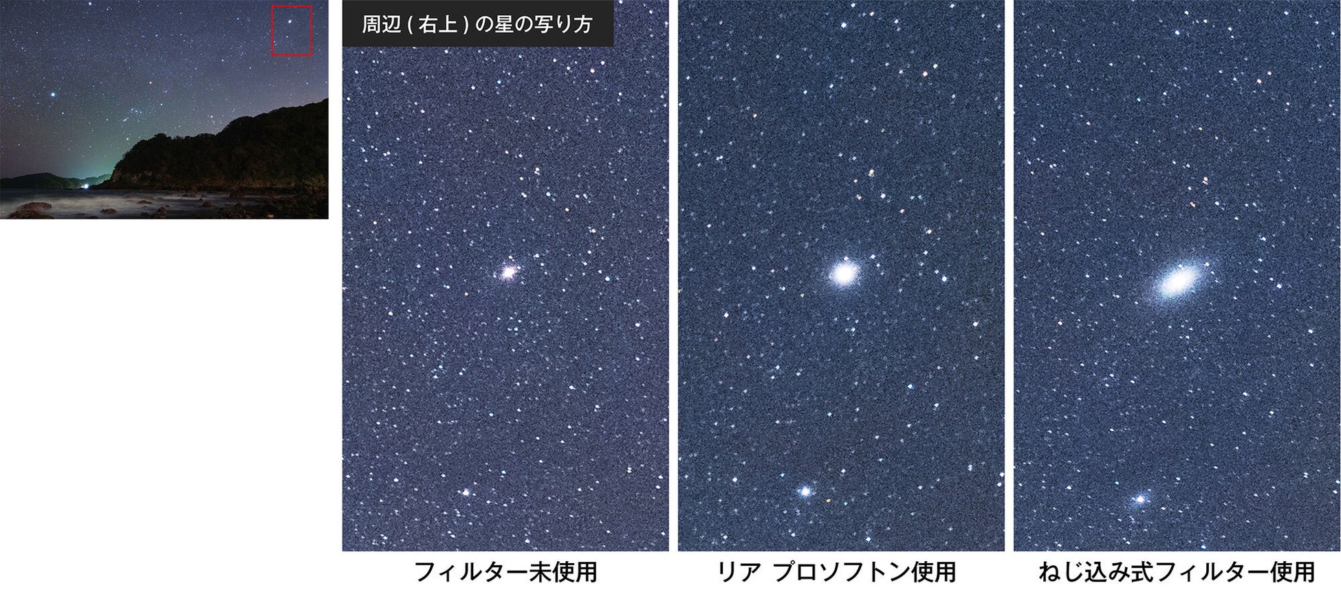 リア プロソフトンはレンズのリア(後面)に使用するシートタイプなので、レンズの前にねじ込み式のフィルターが装着できない超広角レンズでもご使用いただけます。また、ねじ込み式のソフトフィルターを広角レンズに使用すると、画面周辺の明るい星が放射状に伸びてしまいますが、リア プロソフトンは放射状の伸びがほとんど気になりません。