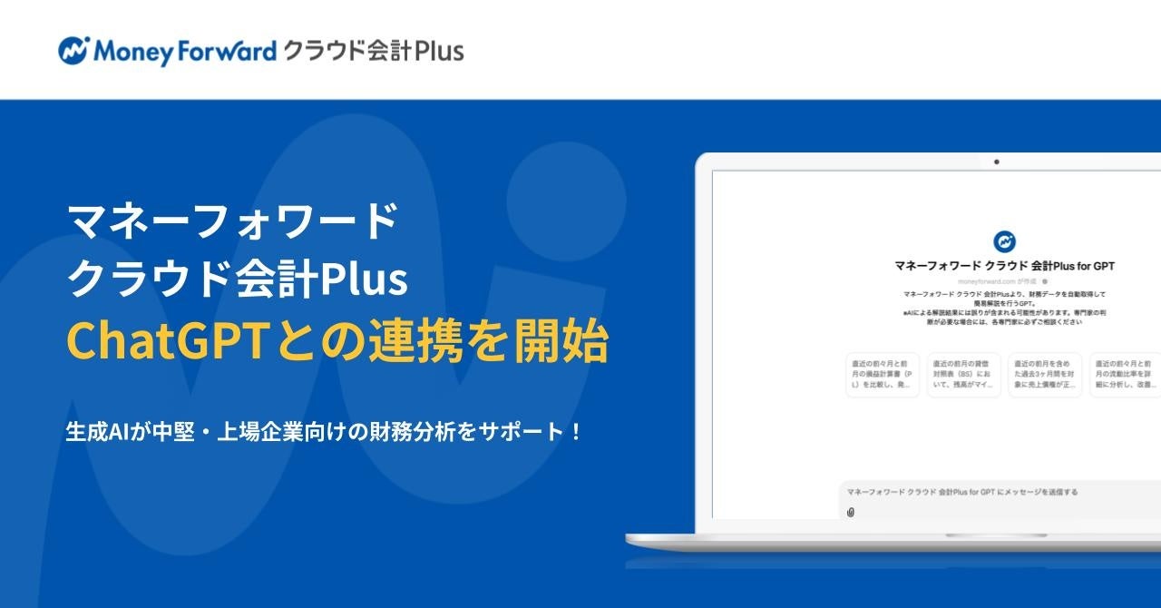 株式会社マネーフォワードは、『マネーフォワード クラウド会計Plus』において「マネーフォワード クラウド 会計Plus for GPT」を提供します。ChatGPTと連携し、中堅・上場企業の経理財務業務に合わせて、生成AIが財務分析をサポートします。