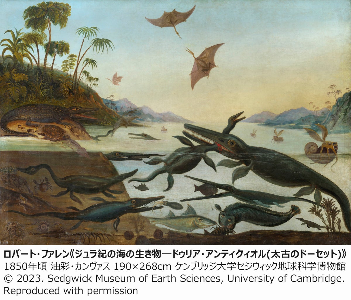 本展の冒頭を飾るのは、19世紀の恐竜“発見”から間もない時期に描かれた、パレオアート黎明期の作品群です。地質学者ヘンリー・デ・ラ・ビーチの原画による《ドゥリア・アンティクィオル(太古のドーセット)》は、イギリスの女性化石採集者、メアリー・アニングの功績をたたえるために制作された版画で、古生物の生態を復元した史上初の絵画のひとつと言われています。本展では、デ・ラ・ビーチの原画に基づくジョージ・シャーフの版画に加え、これを拡大したロバート・ファレンによる油彩画を出品します。