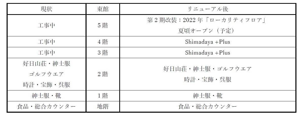 | ○全館売場面積の約70%をリニューアルします。 改装面積:7,350㎡(全館売場面積:10,500㎡) 売場の約70%をリニューアル ○改装対象フロア 第1期:本館2階・3階・4階・5階、東館1階・2階・3階・4階 第2期:東館5階 ※食品フロアは2021年9月に改装しております。 ○ リニューアルオープン 第1期:2022年3月25日(金)(予定) 第2期:2022年夏頃(予定) |