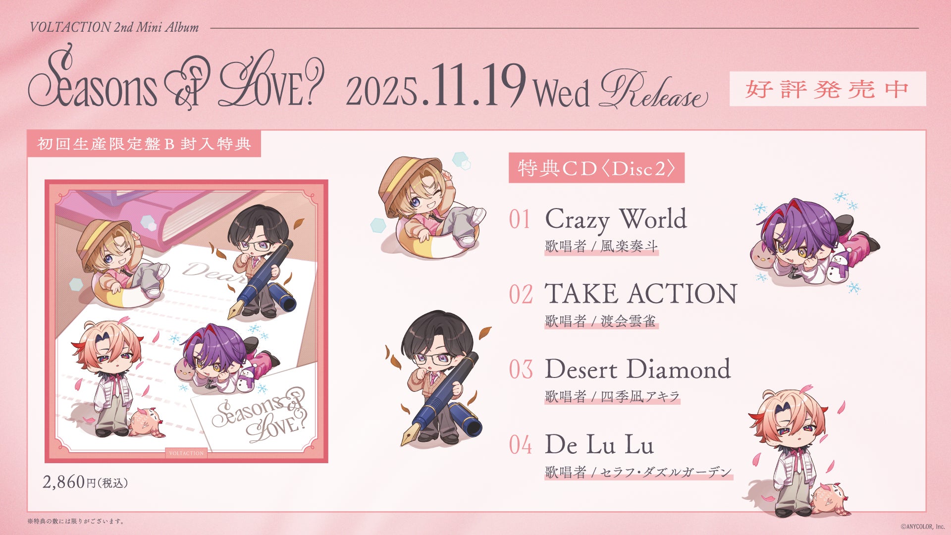 VOLTACTION 2nd Mini Album『Seasons of LOVE?』は春夏秋冬の恋をテーマに、甘酸っぱい恋や楽しい恋、そして切ない恋まで、VOLTACTIONらしいラブソングを全6曲収録。初回生産限定盤Aには恋する5連アクリルキーチャーム&ヘアバンド、ソロアナザージャケット全4種セットを同梱いたします。初回生産限定盤Bには1st Mini Albumでもご好評いただいた、VOLTACTIONオリジナル楽曲からメンバー自身が選んだソロセルフカバー4曲を収録した特典CDを同梱いたします。