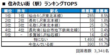 ※「住みたい街(駅)ランキング」は、宮城県居住者の2025年の回答を東北エリアの駅を対象にしてランキングを集計しています。「住みたい街(自治体)ランキング」は、宮城県居住者の2025年の回答を全国の自治体を対象にしてランキングを集計しています。