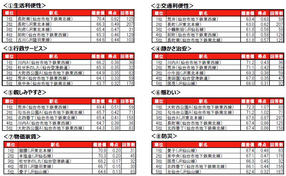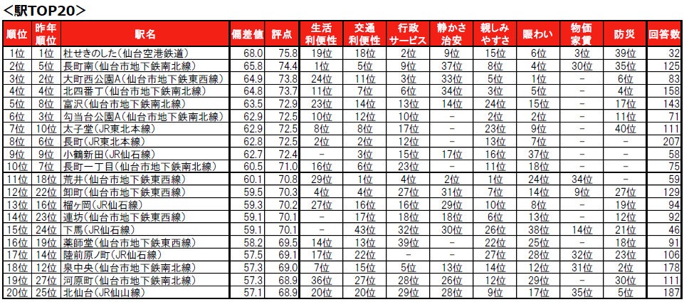 昨年初登場の名取市に位置する杜せきのした(仙台空港鉄道)が、2年連続で1位に輝きました。2位は仙台市太白区に位置する長町南(仙台市地下鉄南北線)で、昨年5位から順位を上げました。3位は大町西公園A(大町西公園・青葉通一番町を統合)です。トップ10内では、「住みここち(自治体)」で3位の仙台市太白区に位置する駅(長町南・富沢・太子堂・長町・長町一丁目)や、4位の仙台市青葉区に位置する駅もしくは近接駅を統合した駅(大町西公園A・北四番丁・勾当台公園A)が昨年に引き続き多数ランクインしています。