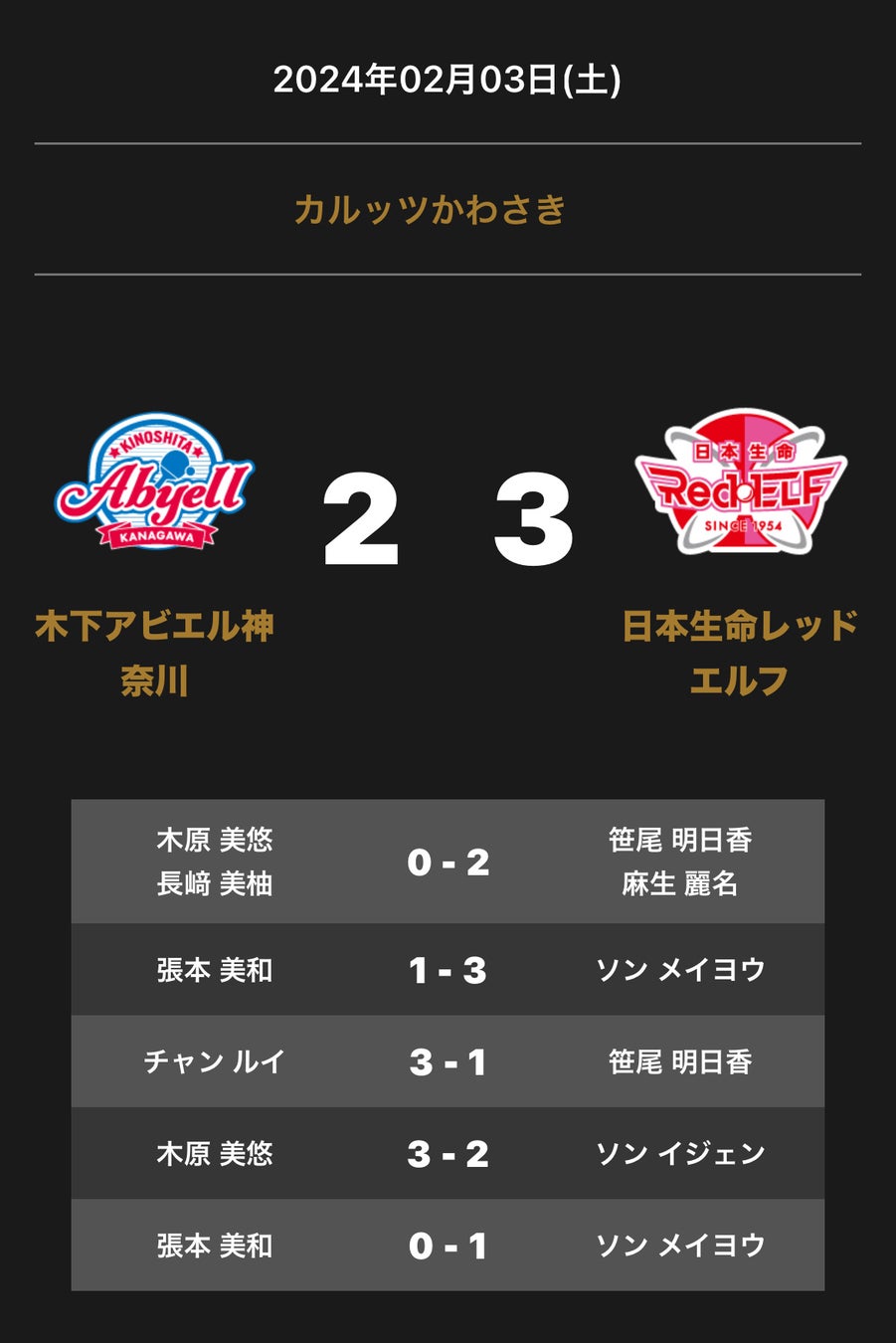 ノジマTリーグ 2023-2024シーズン 公式戦 2月3日開催 「木下アビエル神奈川 vs 日本生命レッドエルフ」の試合は、3-2で日本生命レッドエルフが勝利しました。
