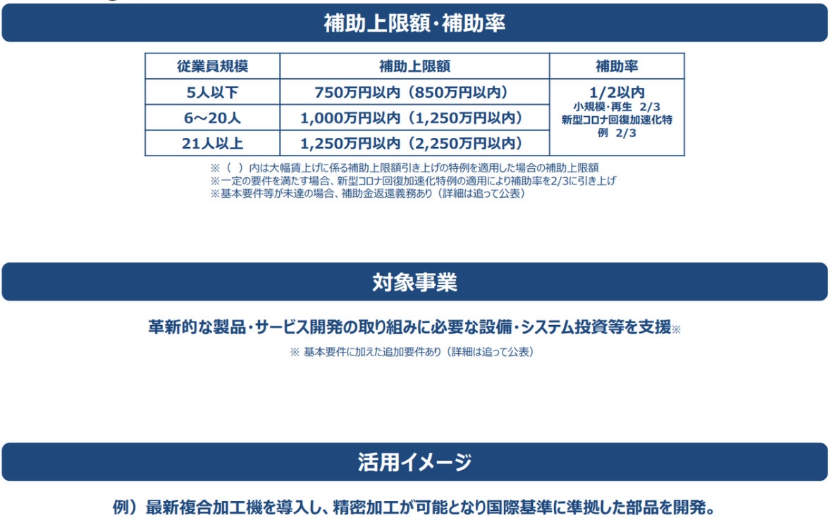 ・対象経費:機械装置・システム構築費、技術導入費、専門家経費、運搬費、クラウドサービス利用費、原材料費、外注費、知的財産権等関連経費