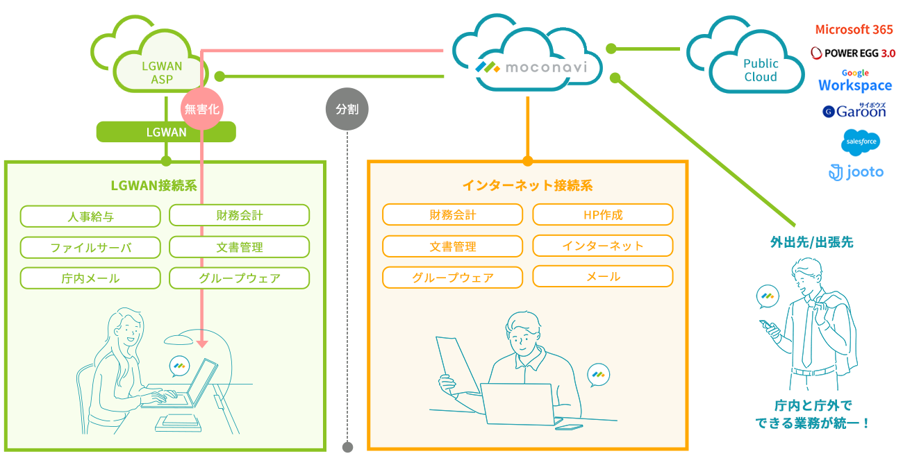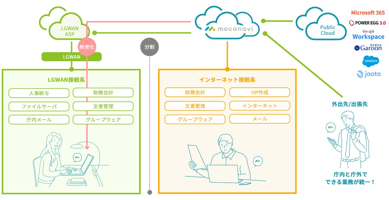 「moconavi LGWANクラウドゲートウェイ」はLGWAN環境や庁外から、Microsoft365、Garoon、POWER EGGなど、さまざまなクラウドサービスが利用可能になるサービスです。高機能セキュアブラウザとファイル無害化機能を標準搭載しており、LGWANとインターネット通信を分離し安全な通信環境を実現。地方自治体における業務の効率化、利便性の向上につながります。