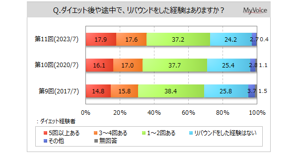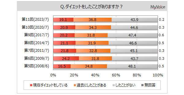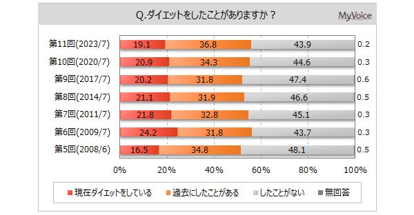 <今 回>(2023/7)https://myel.myvoice.jp/products/detail.php?product_id=30009 上記設問の他に、「ダイエットをする理由」「ダイエットをやめた理由」も聞いています。 <第10回>(2020/7)https://myel.myvoice.jp/products/detail.php?product_id=26407 <第9回> (2017/7)https://myel.myvoice.jp/products/detail.php?product_id=22812 |