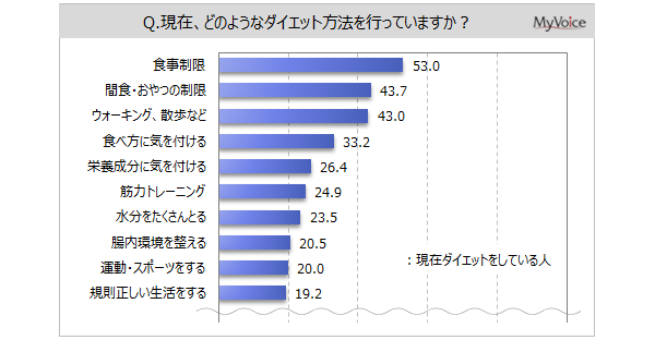 現在ダイエットをしている人が行っている方法は(複数回答)、「食事制限」が53.0%、「間食・おやつの制限」「ウォーキング、散歩など」が各4割強、「食べ方に気を付ける(時間帯、食べる順序、ゆっくり食べるなど)」が33.2%です。