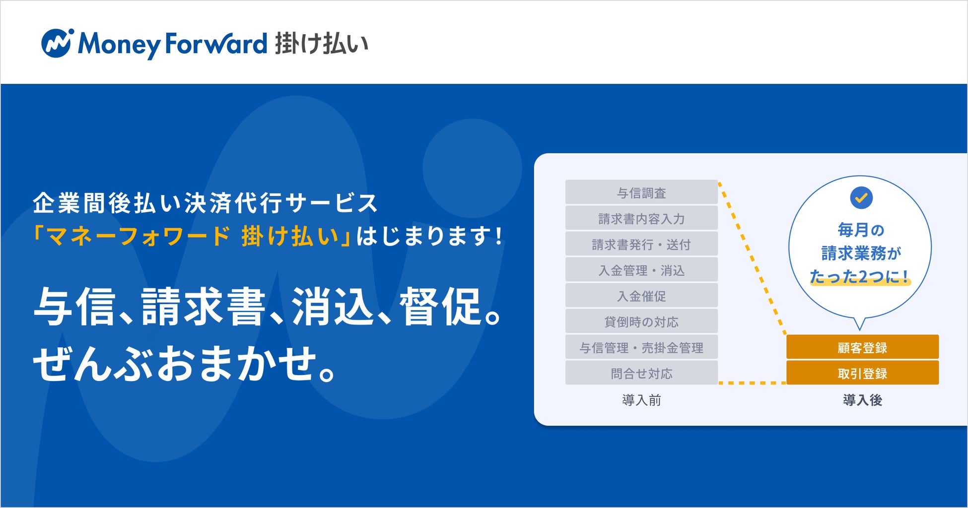 株式会社マネーフォワードは、企業間後払い決済・請求業務を一括代行する新サービス、『マネーフォワード 掛け払い』を提供します。当社の「SaaS×Fintech」戦略の一環として、バックオフィスSaaS『マネーフォワード クラウド』と連携性の高い企業間決済・請求代行サービスを提供することで、煩雑なバックオフィス業務を効率化し、ユーザーがビジネスに専念できるようサポートします。