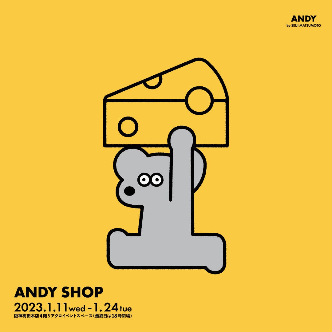 阪神梅田本店4階リアクロイベントスペースでは、2023年1月11日(水)→1月24日(火)まで、アーティスト・松本セイジが描く“ねずみのANDY”の期間限定ショップ「ANDY SHOP」を開催いたします。丸い目のおどけた表情がチャームポイントのANDYのキッチン用品や文房具など、多数のアイテムが並びます。さらに、阪神梅田本店先行販売アイテムも登場。シンプルなデザインながらもキュートなANDYの世界観をお楽しみください。