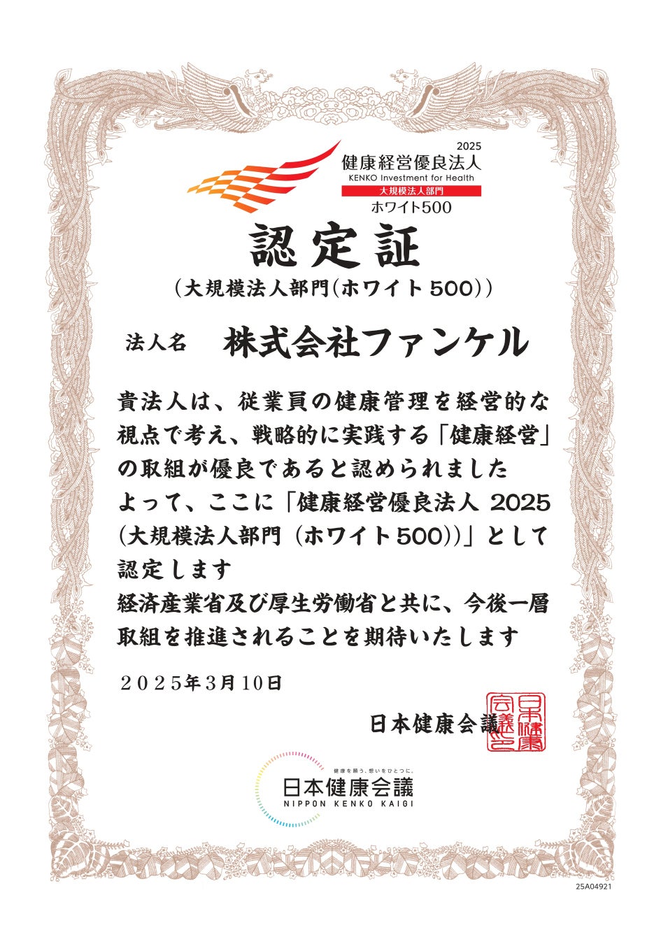 健康経営優良法人認定制度は、従業員の健康管理を経営的な視点で考え、戦略的に実践する「健康経営」の取り組みが優良である企業を顕彰する制度です。2017年から9年連続の表彰で、大規模法人部門(ホワイト500)の一社として認定を受けました。