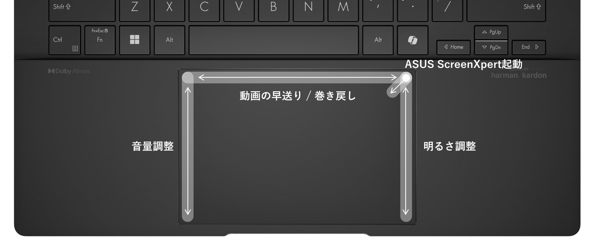 操作が快適に行える、広々としたタッチパッドを搭載しています。このタッチパッド部分の左右および上部にはファンクションが割り当てられており、上部で指を左右にスライドさせると動画の早送り/巻き戻し、左側で指を上下にスライドさせると音量調整、右側で指を上下にスライドさせるとディスプレイの明るさ調整を瞬時に行うことができます。また、右斜め上から、左下にスワイプすると、ASUS ScreenXpertアプリを開くことができ、あらゆる設定を行うことが可能です。