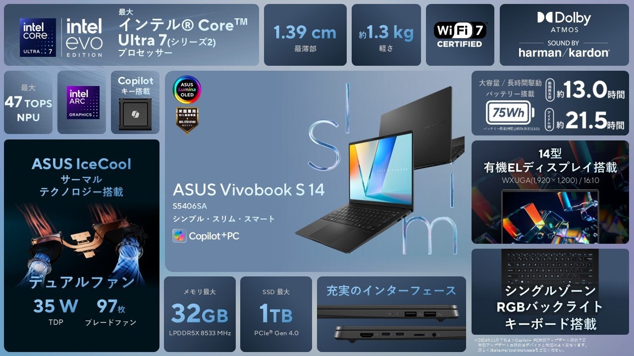 ASUS JAPAN株式会社は、Copilot+ PCに準拠し、最大47TOPSのNPUを内蔵した「インテル® Core™ Ultraプロセッサー(シリーズ2)」を搭載し、日常のあらゆる作業やタスクも快適にこなせる「ASUS Vivobook S 14 S5406SA」を発表いたしました。本日より販売いたします。