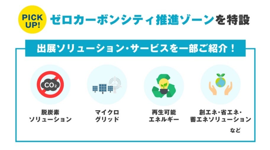 本展では、ゼロカーボンシティ推進ゾーンを特設しております。最新トレンドや活用事例の情報収集まで様々なニーズや疑問を特設ゾーンで一気に解決できます。