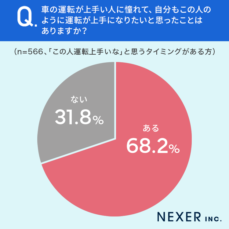 また68.2%の方が車の運転が上手い人に憧れて、自分も運転が上手になりたいと思ったことが「ある」と回答しています。