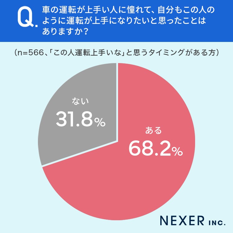 68.2%と7割近くの方が車の運転が上手い人に憧れて、自分もこの人のように運転が上手になりたいと思ったことが「ある」と回答しています。