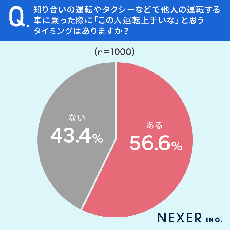 56.6%と半数以上の方が、「この人運転上手いな」と思うタイミングが「ある」と回答しています。