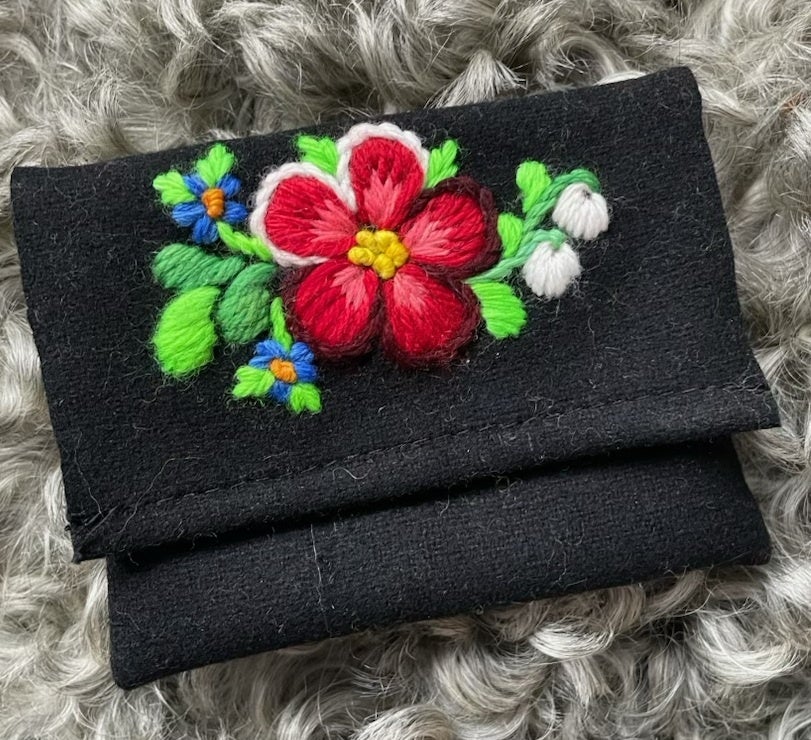ポーソム刺しゅう作家のアンナ=カーリンさんから、刺しゅうの文化や手しごとにまつわるお話を聞き、スウェーデン・ダーラフローダ村伝統の鮮やかな花模様刺しゅうをあしらったカード入れを制作。