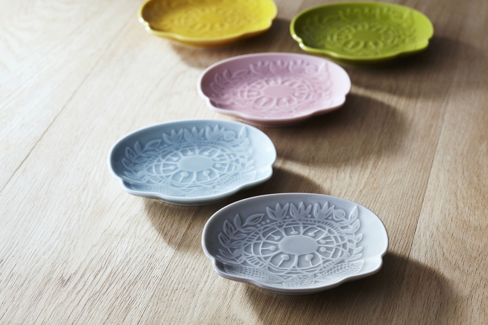 <ファンレイソン>の人気デザイン「タイミ」を、フィンランドカラーの釉薬を使い有田焼で表現しました。