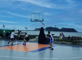藤沢市立鵠沼海浜公園[HUG-RIDE PARK]駐車場では、湘南の象徴、江の島をバックに設置される 特設コートで、3×3のトップチーム同士によるエキシビジョンマッチや U-15 交流戦が開催されています。