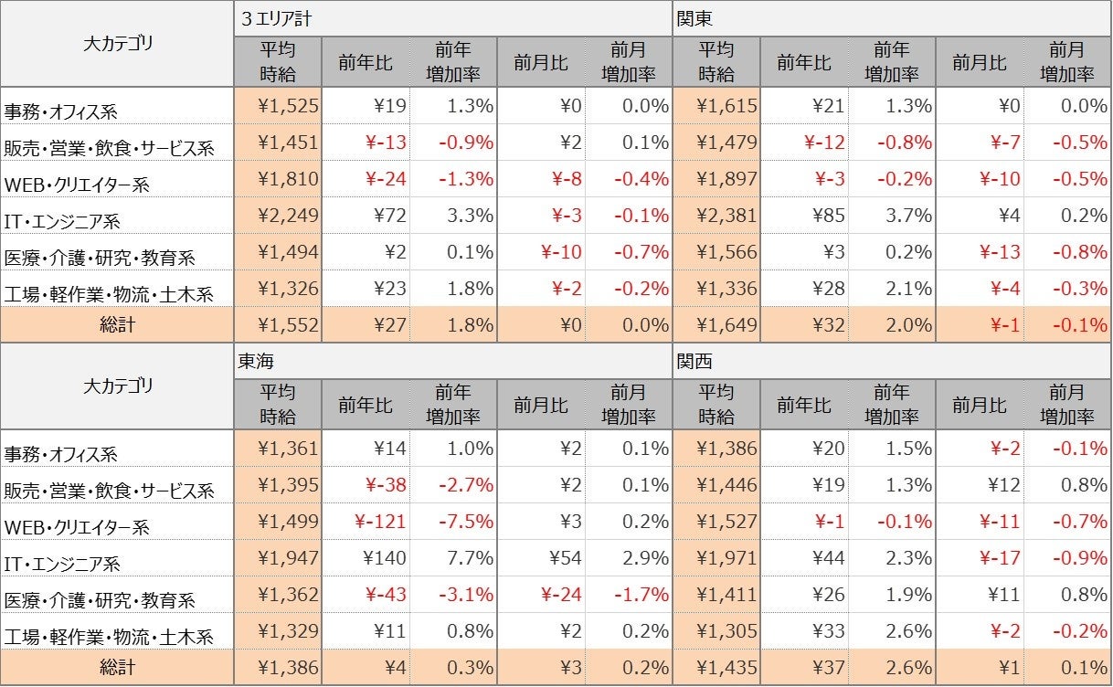 各エリアの平均時給について、関東エリアは1,649円(前年比32円増、前月比1円減)、東海エリアは1,386円(前年比4円増、前月比3円増)、関西エリアは1,435円(前年比37円増、前月比1円増)となりました。