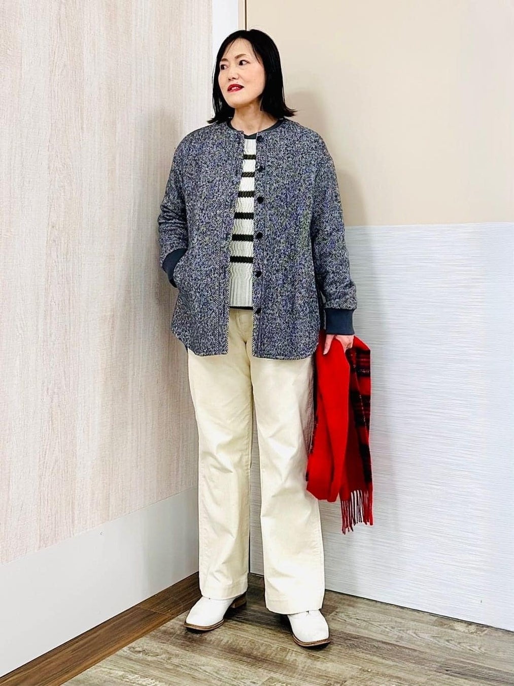太めのストレートシルエットを活かしたリラックススタイルがおすすめ。細い畝のコーデュロイはコーディネートに取り入れやすく、冬らしい季節感もプラスしてくれます。ボーダー柄のトップスやカラーニットなど、存在感のあるアイテムを合わせるとメリハリの効いた着こなしが叶います。