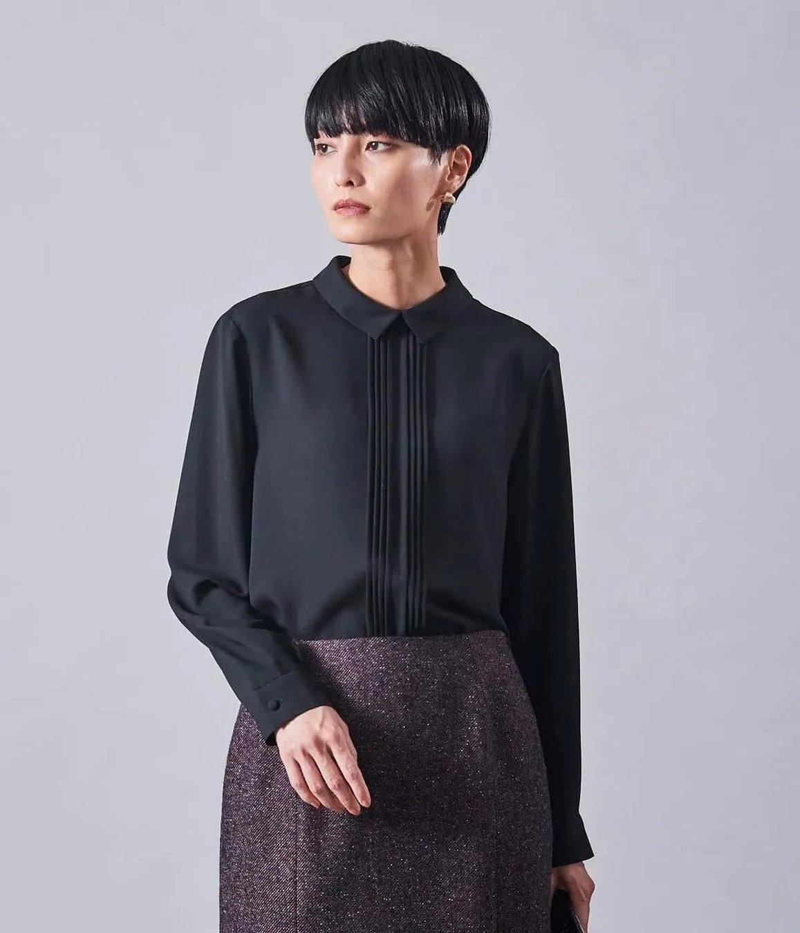 スーツのインナーとして着用すれば、好印象かつクラシカルなムードに。ジャケットの前立てから覗くピンタックがさりげないアクセントを添えてくれます。襟のデザインを活かして、ジャンパースカートにインするのもおすすめ。小ぶりな襟が上品で、主張しすぎずきちんと感を演出します。