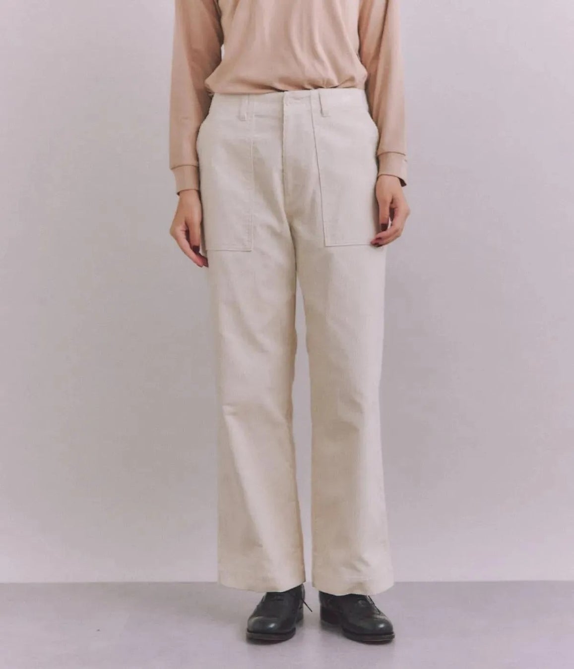 ヨコ糸にオーガニックコットンを使用したコーデュロイ生地のベイカーパンツ。フロントの大きなポケットとバックにあるフラップ付きのポケットが特徴です。ミリタリーパンツよりもソフトな雰囲気を演出してくれます。