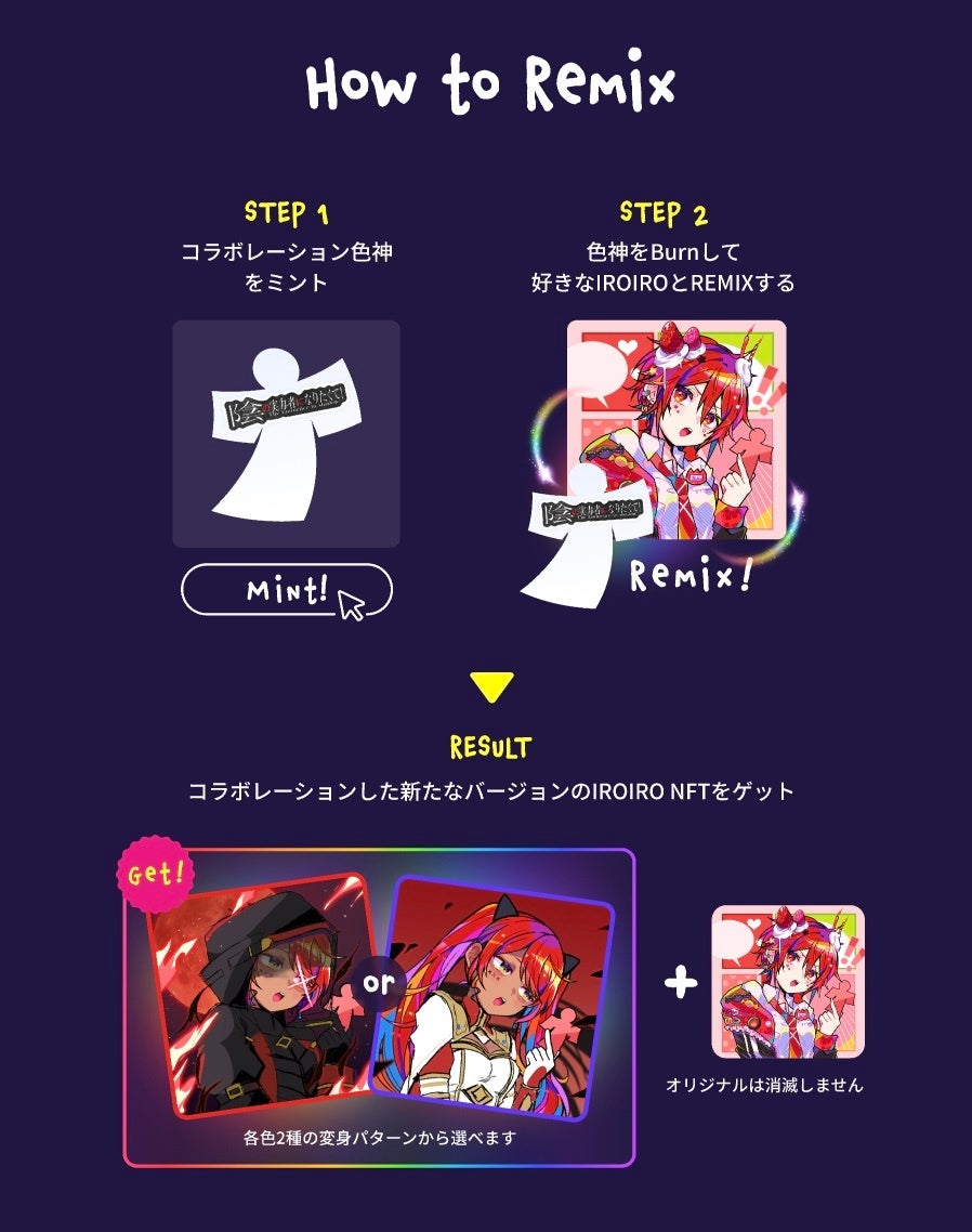 IROIROのNFTを所有するホルダーが、元のIROIROのカラー(AKA、MOMOなど)を活かしながら、これまでとは異なる新たなバージョンを生成することができる新機能です。 この機能は、Web2のブランドやIPを、最もカラフルにWeb3に導入していく架け橋となります。
